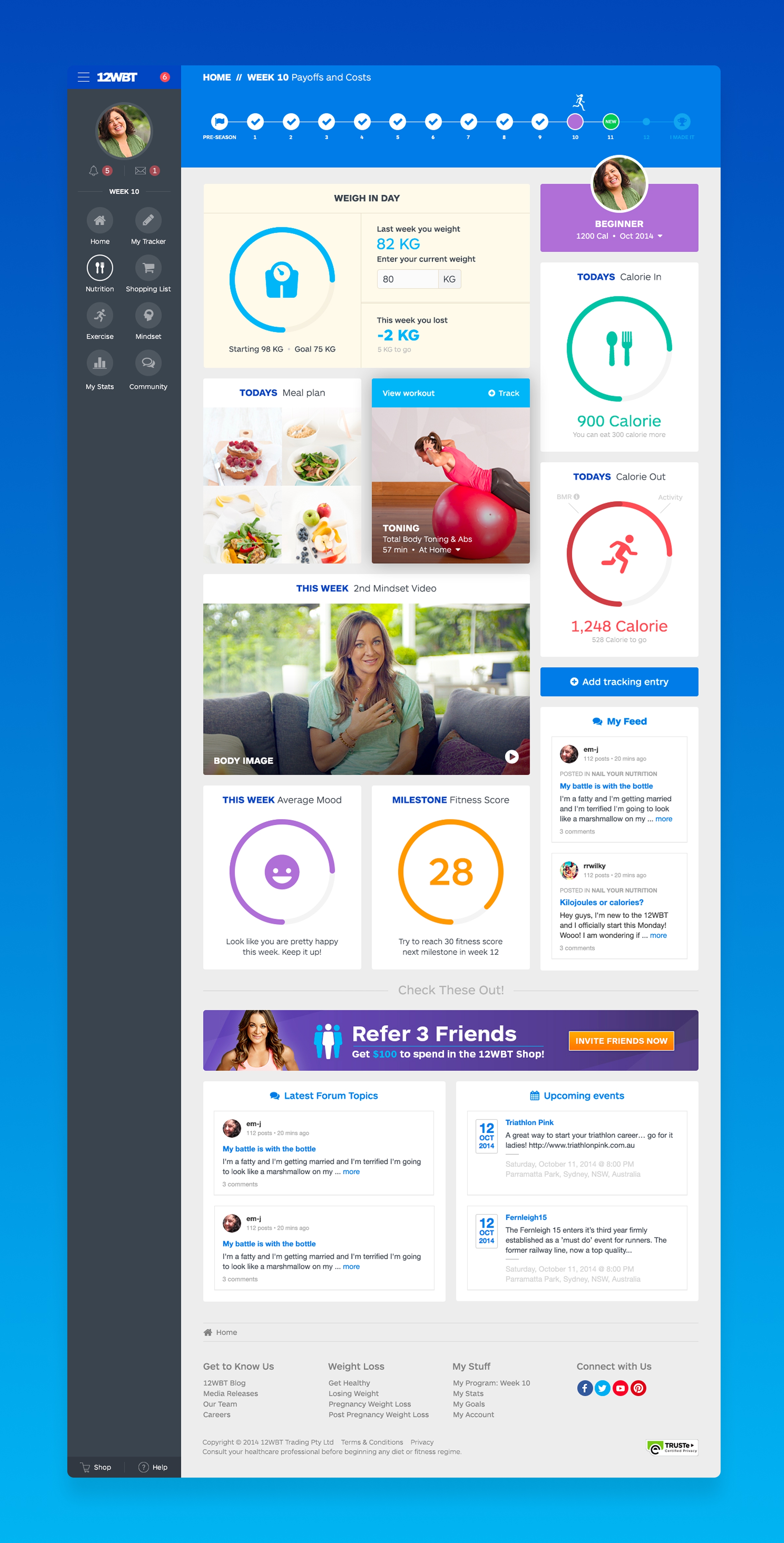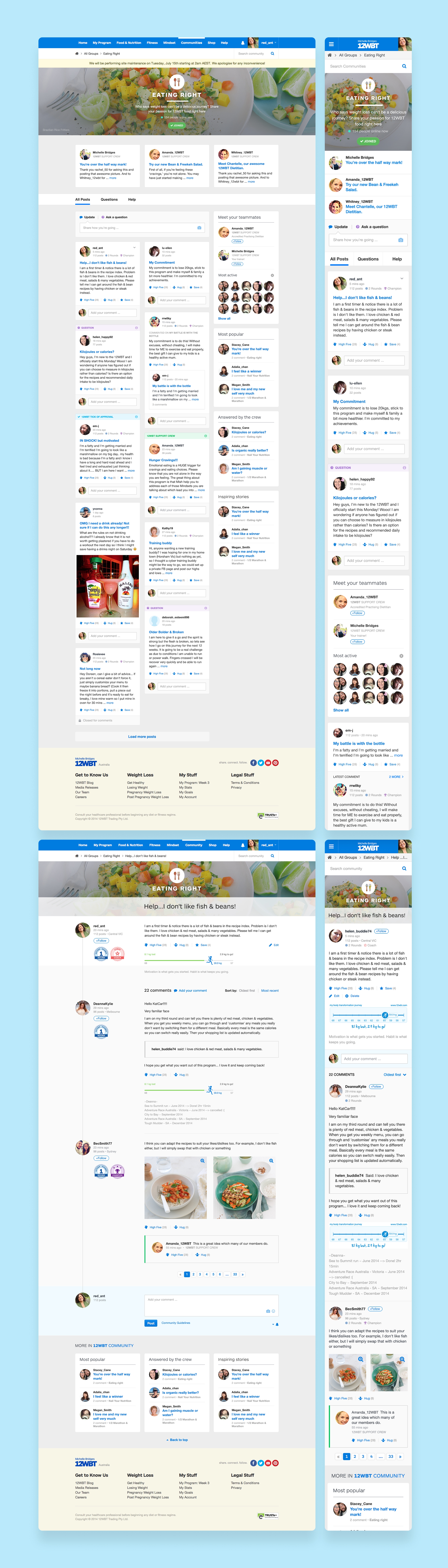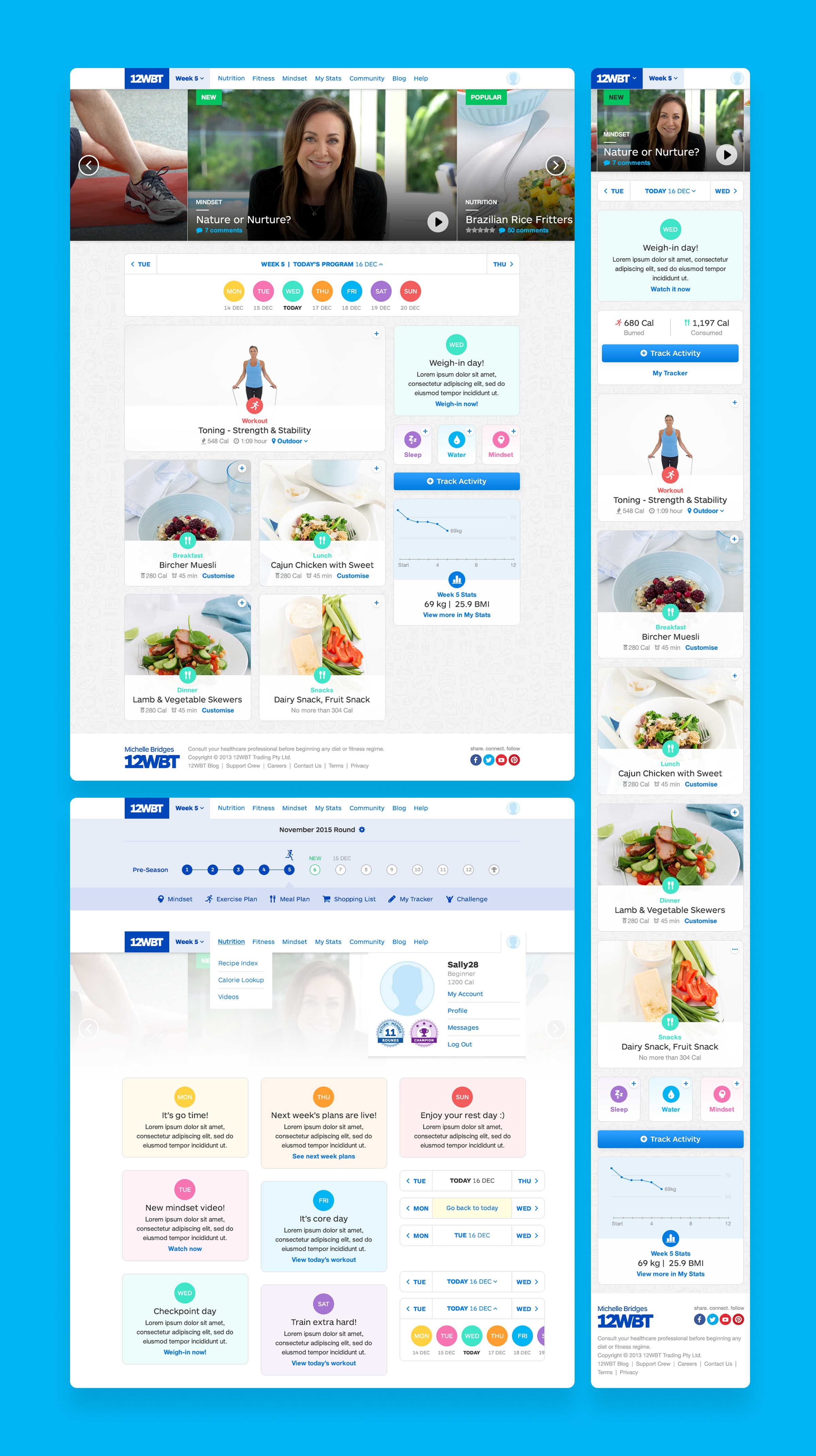 My design work extended across the entire 12WBT ecosystem, including personalised meal plan interfaces with dietary preference customisation, shopping lists with Woolworths integration, and user-centric tracking tools like My Stats and My Tracker that visualised user progress. I also designed and optimised various iterations of marketing pages and homepages, significantly improving user conversion rates through strategic layout, messaging and optimised sign-up and payment processes.