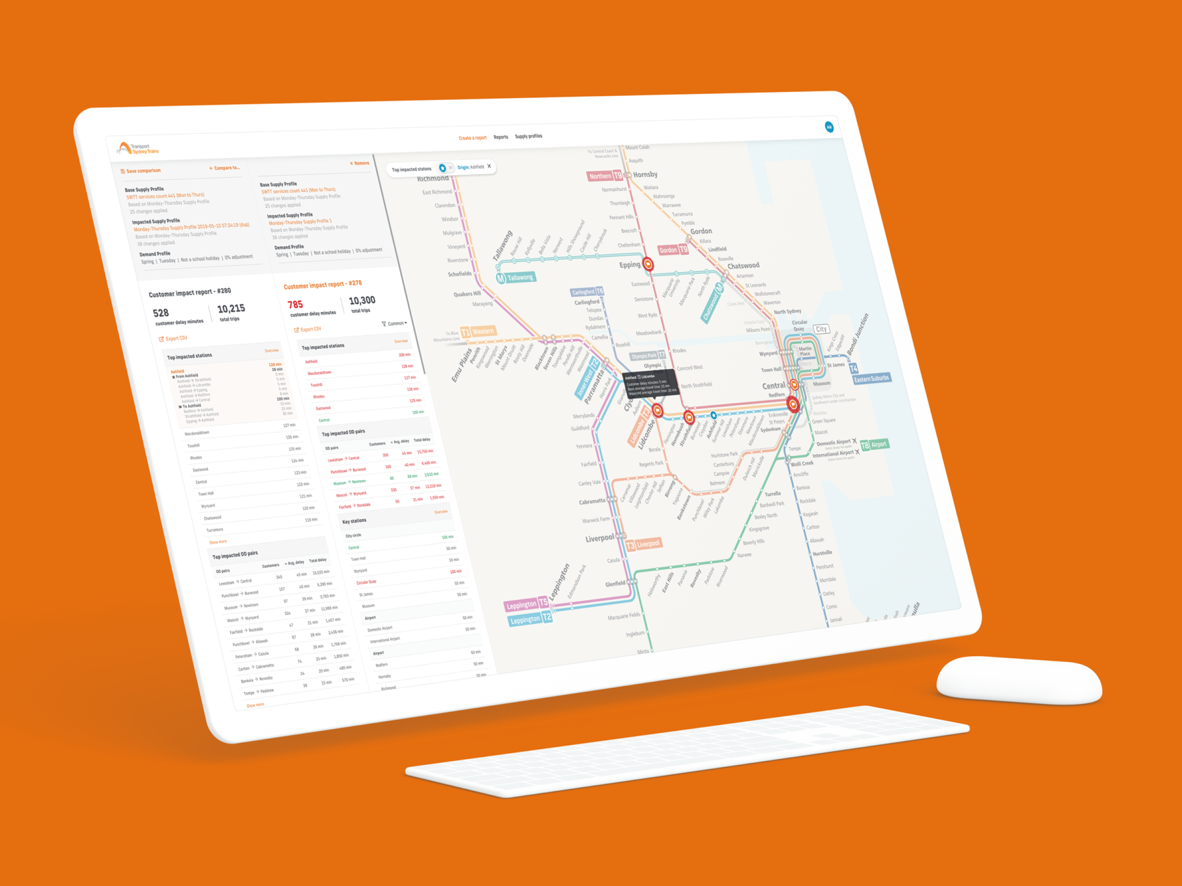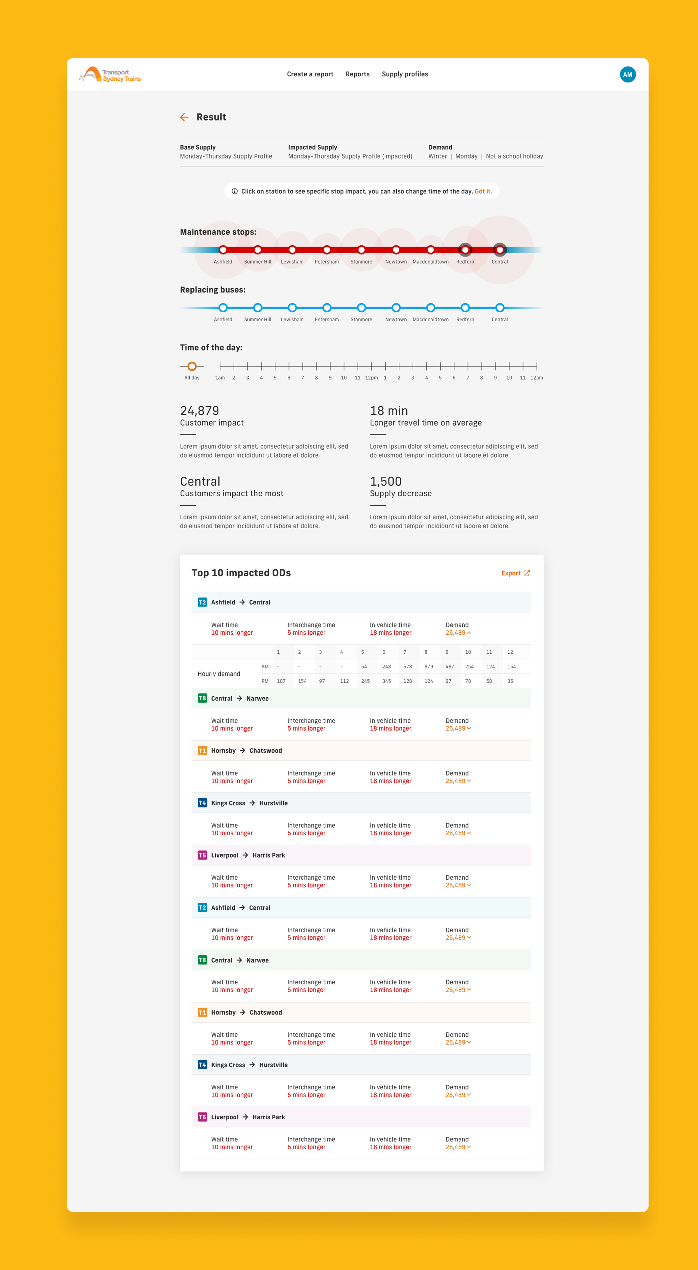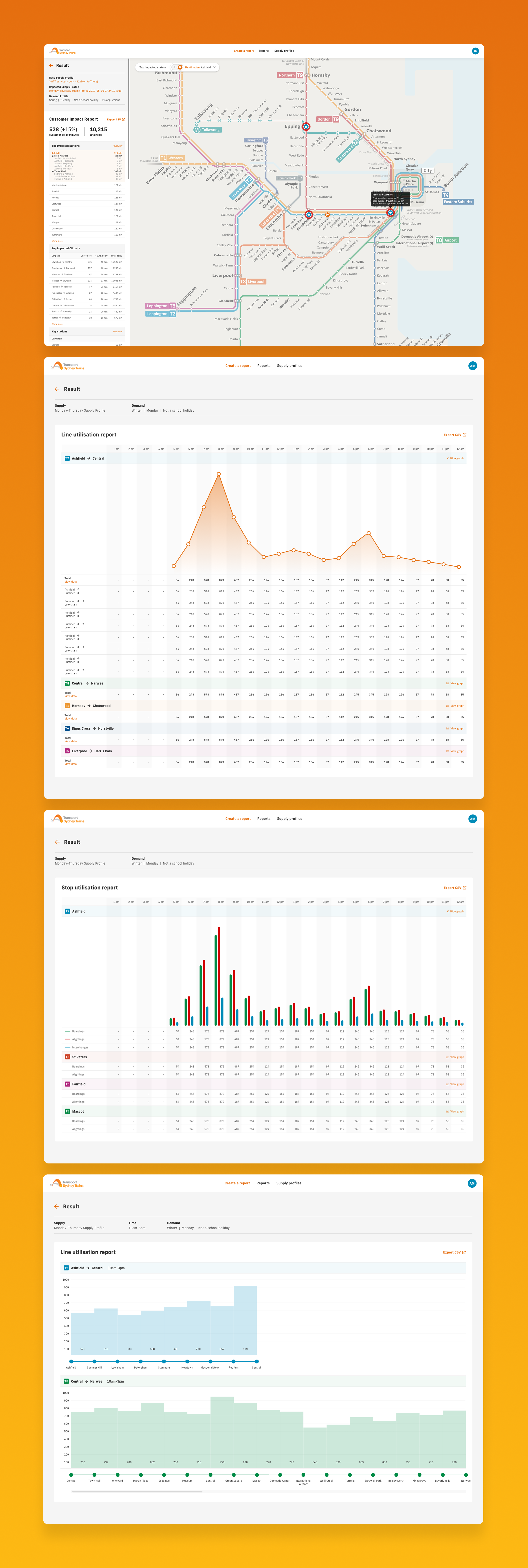 I designed an interface that visualised service impacts across the network, displaying changes to wait times, interchange times, and in-vehicle times. The mapping visualisations helped users understand where disruptions would occur, while graphs and data displays showed customer impact for different service plan scenarios.