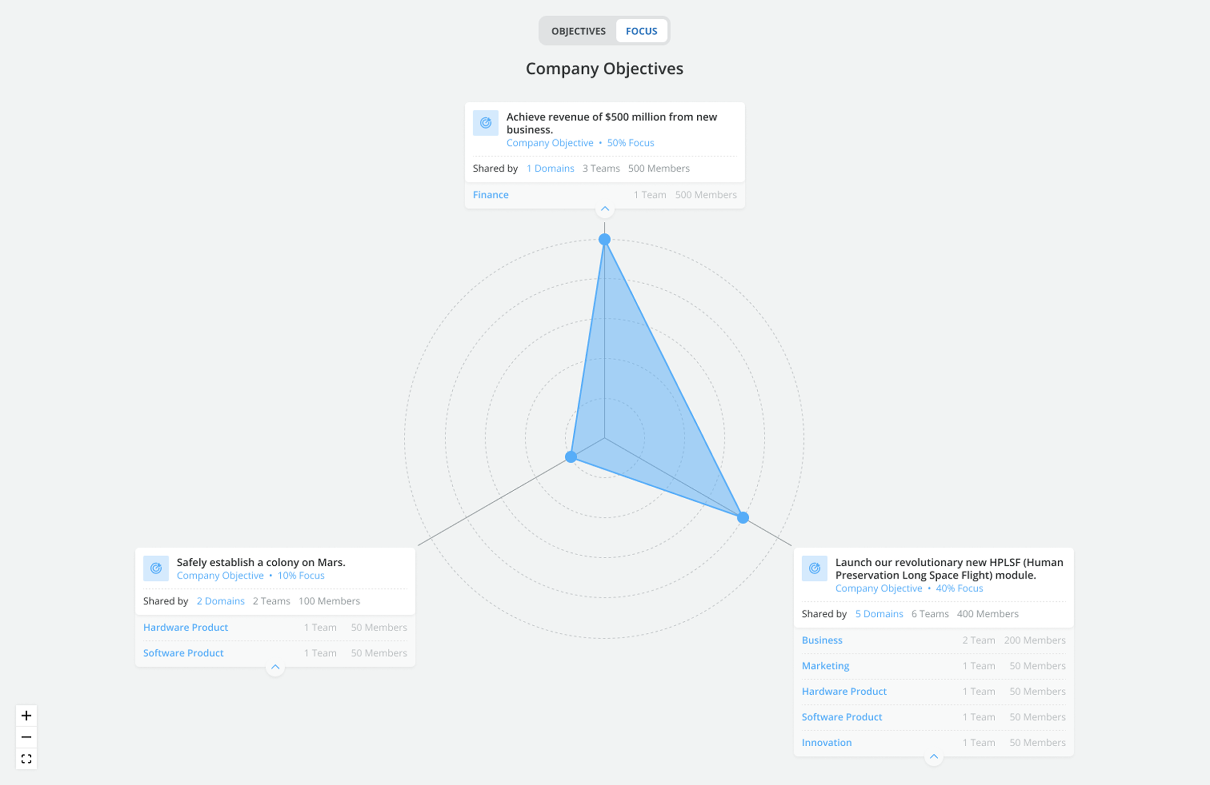 I created 2 views: one that maps OKRs in detail using chart form, and a Focus view where users can see the weight distribution across focus areas for their organisation.